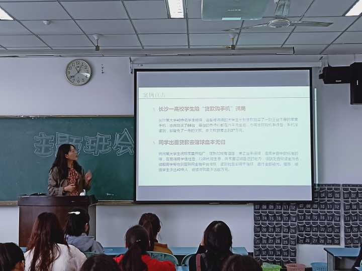 会议伊始,晁佳老师讲述了什么是校园网贷以及校园网贷的途径。如果真的不得不贷款,在贷款前应当确定校园网贷软件是否合法,合同是否合法,是否真的有需要,是否能够偿还,家人是否知情等等。她讲解了校园网贷的发展、是如何运广推行的,同时讲了老师和身边的人的亲身经历,“贷款购手机骗局”、“贷款赌球血本无归”、让同学们深刻意识到校园网贷与我们息息相关,在生活中,任何决定都应当谨慎,任何一个不慎都有可能让自己受到伤害。因此同学们更应当远离校园网贷,避免自己受到伤害!
