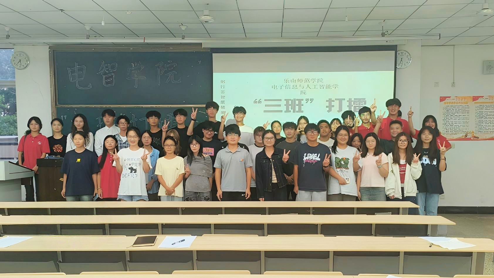 本网讯(文、图/唐根斌)为增强班级凝聚力、加强班级文化建设,10月16日下午,电子信息与人工智能学院在行知楼101开展“三班打擂”活动,本次活动由AI引航辅导员工作室和学生分会联合主办。辅导员肖苗、狄红霞、王杰、徐星悦,班主任代表,主席团成员、新生代班及大一全体学生参与。