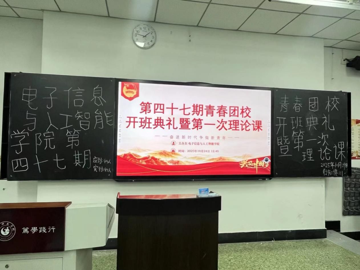 本网讯(文/胡晨希 图/刘谨豪)为进一步巩固和规范团员教育管理,健全学院共青团思想政治引领工作机制,10月24日中午12时40分,电子信息与人工智能学院在行知楼111教室举办第47期青春团校开班典礼暨第一次理论课。本次活动由学院AI引航辅导员工作室与分团委组织部联合主办,学院党委书记蒋强,辅导员肖苗、狄红霞、王杰、徐星悦,分团委副书记孔一鸣、邓钫、曹诗敏、郭爱铭及全体团校学员参加,分团委组织部副部长邓钰主持活动。