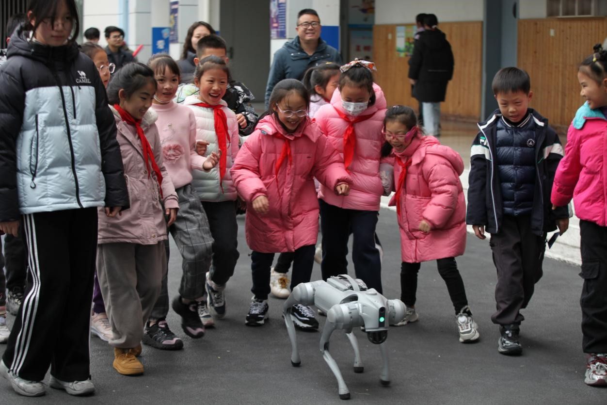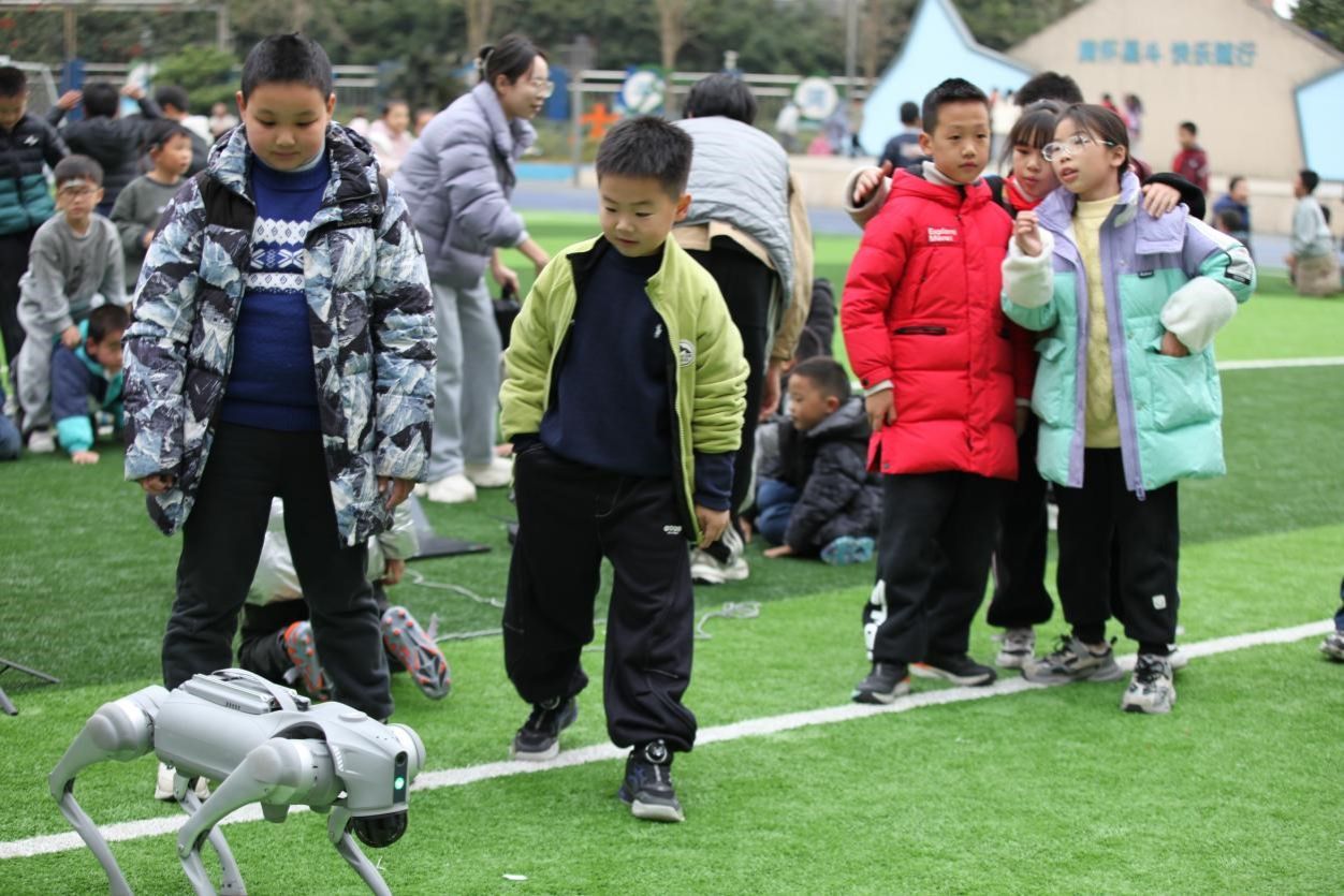 活动伊始,一只灵活灵动的机器狗在青年教师的操控下走进校园,立刻成为全场焦点。它时而迈着轻快的步伐穿梭,时而做出点头、转身等俏皮动作,瞬间点燃了同学们的好奇心。大家纷纷簇拥上前,睁着好奇的眼睛近距离打量这个 “科技小伙伴”,稚嫩的提问声、欢快的笑声此起彼伏,为这场科普活动奏响了轻松愉悦的序曲。
