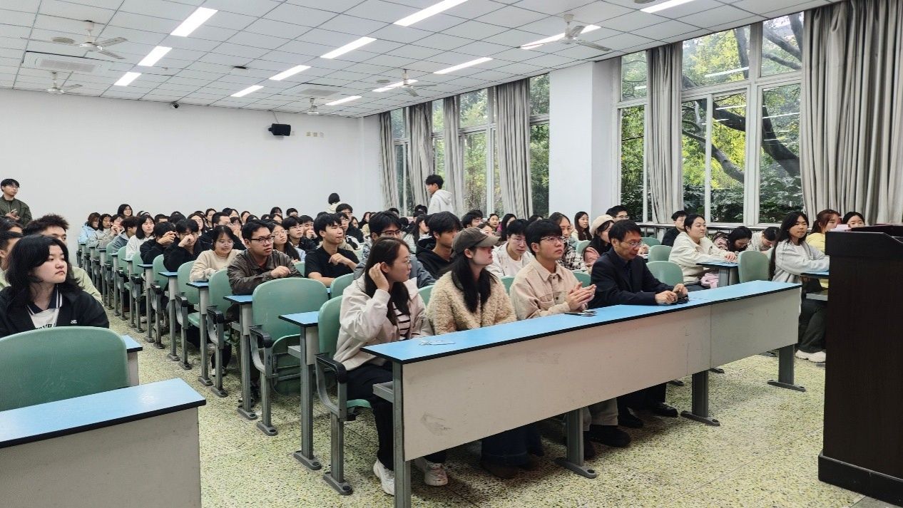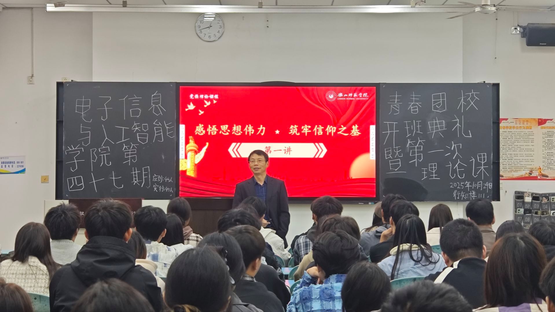 本网讯(文、图/邓莹)10月24日,电子信息与人工智能学院第五十二期入党积极分子、青春团校的学员在行知楼111教室开展第五十二期入党积极分子培训之第一专题党(团)课学习——感悟思想伟力,筑牢信仰之基。本次党课由电子信息与人工智能学院党委书记蒋强主讲,学院师生第二、三、四党支部支部书记王杰、肖苗、狄红霞、25级辅导员徐星悦,第五十二期入党积极分子、青春团校学员共同参加。